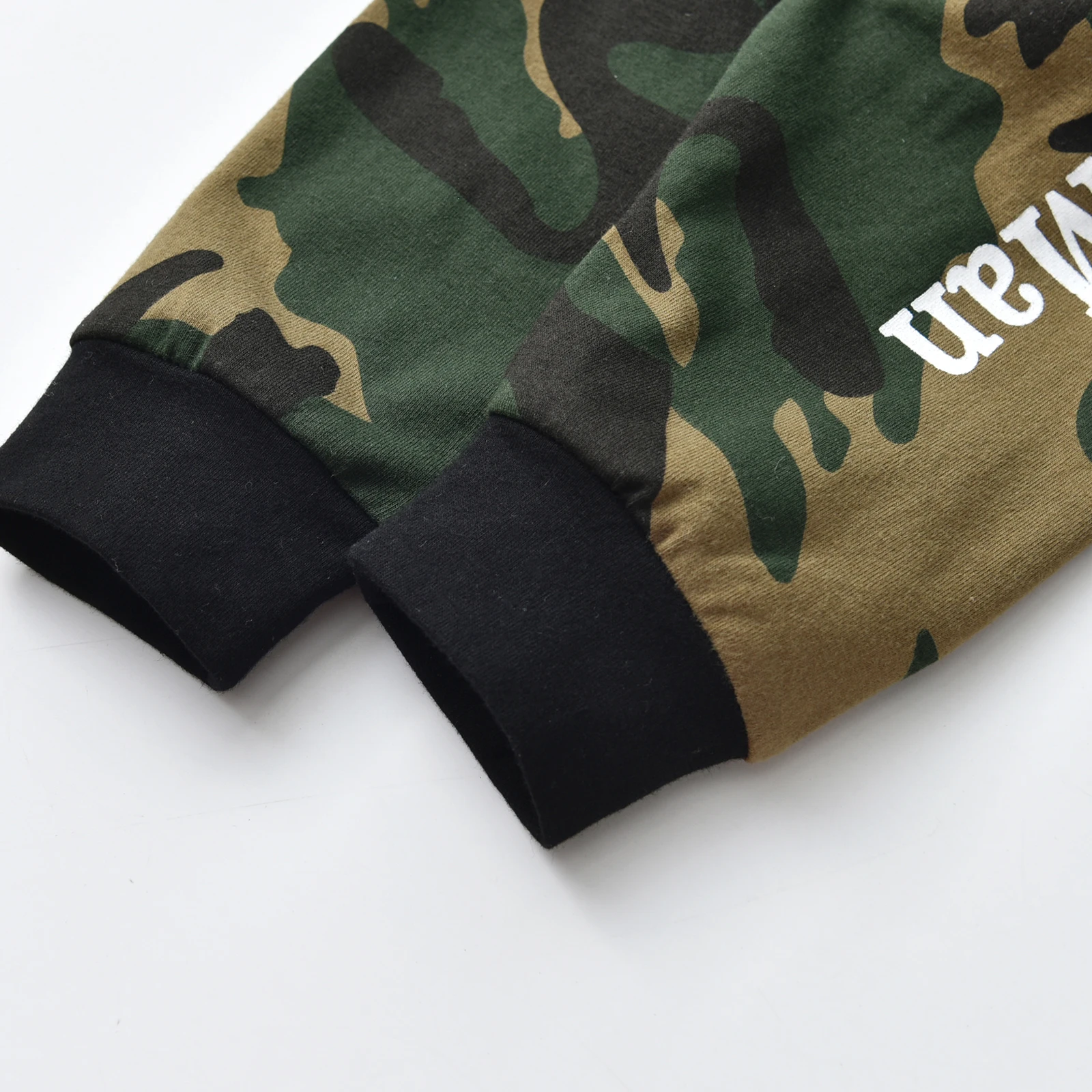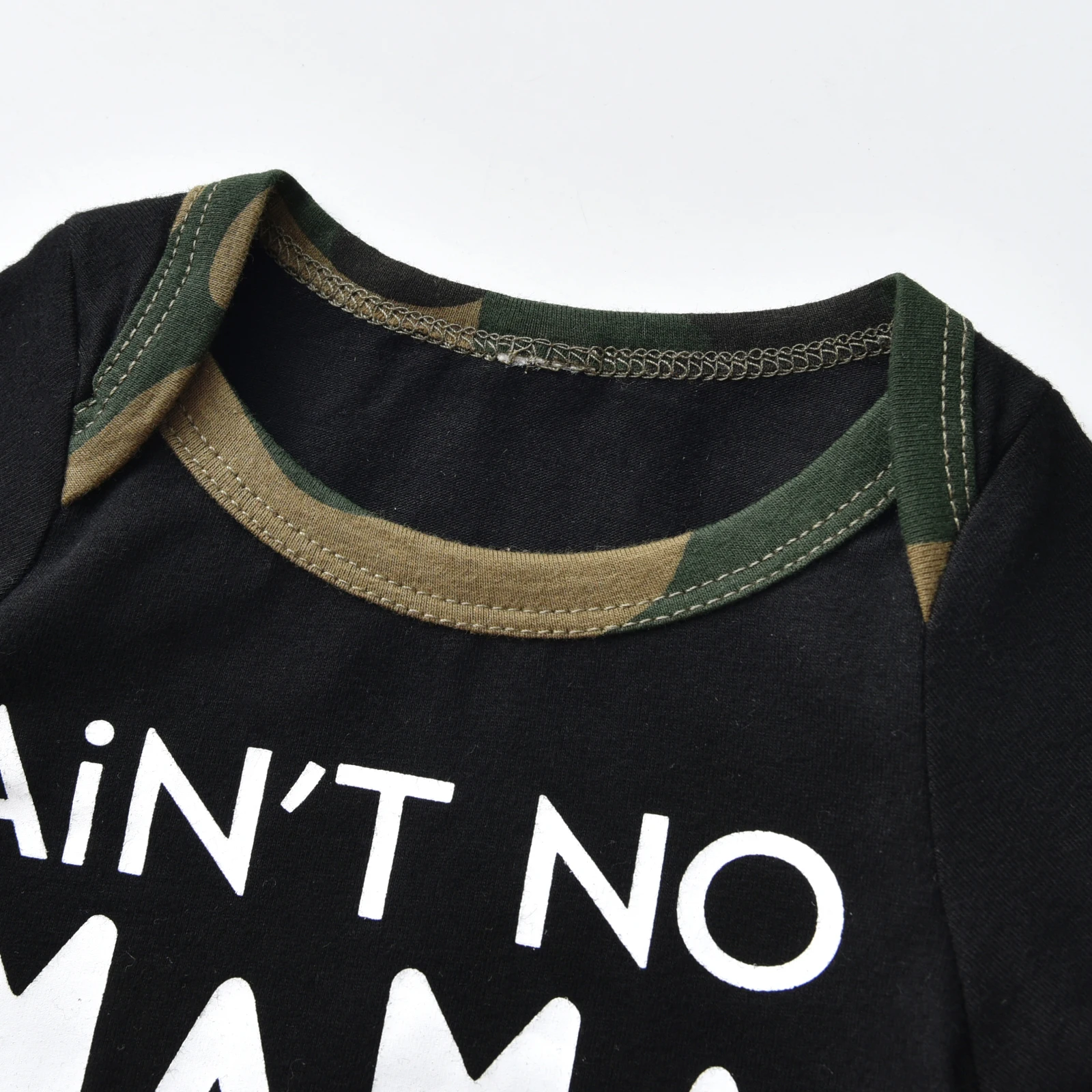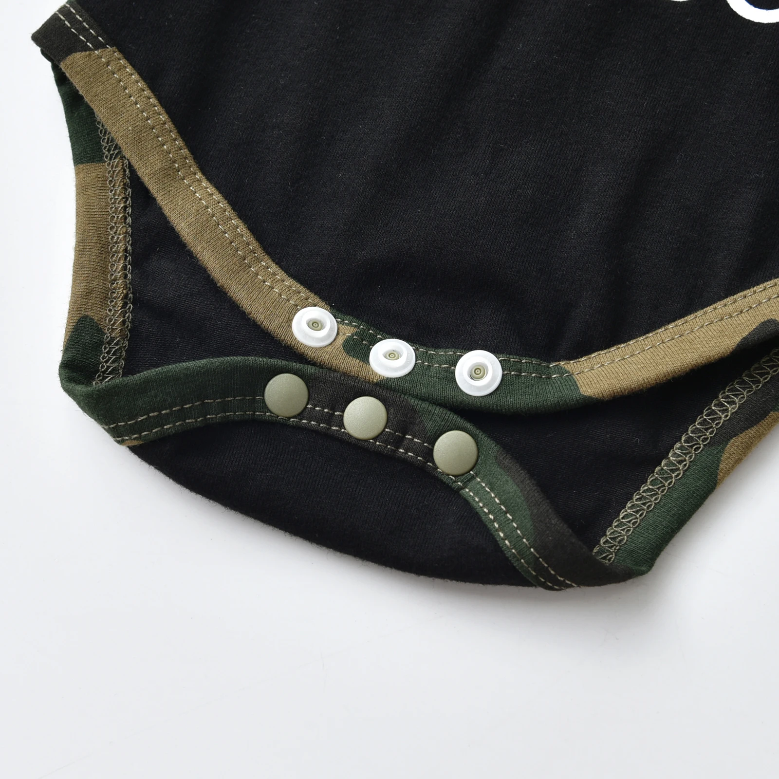 This 3-piece set includes a long sleeve letter print romper, camouflage pants, and a matching hat.